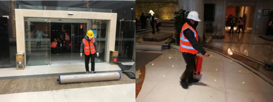 襄陽市抗擊新型冠狀病毒肺炎的形勢依然嚴峻,為更好的遏制疫情蔓延,更好的治療感染患者,襄陽市決定將共享國際大酒店和襄城區(qū)城市名人酒店改造后作為密切接觸人員隔離點。而這項“戰(zhàn)疫”任務,交由市政公司完成!耙咔榫褪敲 防控就是責任” ,襄陽市政建設集團有限公司在接到共享國際大酒店和襄城區(qū)城市名人酒店地面改造任務后,在市政公司領導的統(tǒng)一安排部署下,立即克服種種困難,組織人力物力,投入到施工任務中。在改造任務中,共享國際大酒店需對6至16樓共計210間房間進行改造,城市名人酒店需對2至9樓共計146間房間進行改造。時間緊,任務重,施工專班決定兵分兩路,一路立即前往隨州進行物資采購運輸,一路立即前往施工現(xiàn)場勘察,做施工前準備工作。前往隨州緊急購買調(diào)運的醫(yī)用PVC地板已于凌晨全部抵達施工現(xiàn)場,而早已從各處趕來的70多位襄陽市政建設集團的“逆行者”們一直在施工現(xiàn)場枕戈待命,在凌晨物質(zhì)抵達后立即投入到酒店改造施工任務中。
